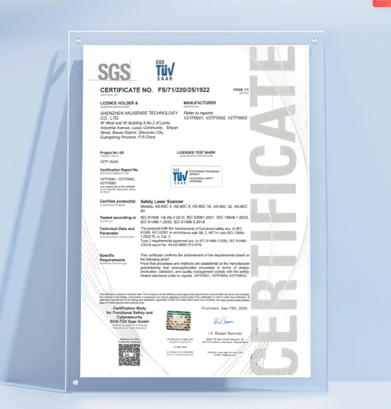 Met de opkomst van autonome systemen en slimme productielijnen wordt functionele veiligheid steeds belangrijker. De AKUSENSE AS-60C Safety LiDAR speelt hierop in met een combinatie van hoge meetnauwkeurigheid en gecertificeerde veiligheid.
